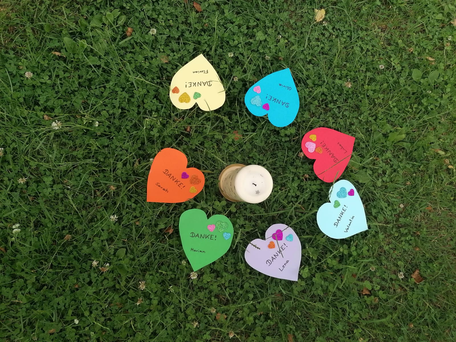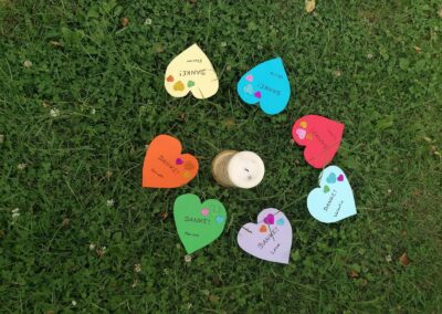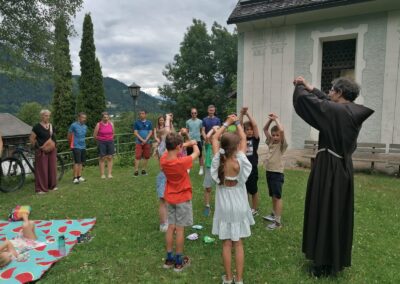 Die EK Kinder kommen mit ihren Familien per Fahrrad zum Ulrichsbichl, wo P. Martin ihnen die Legende des Hl. Ulrichs erzählt. Die Kinder lesen ihre Danke-Texte vor, die sie auf ein Herz geschrieben haben und legen sie anschließend rund um ihre Erstkommunionkerze hin. Die Herzen gehen so richtig auf beim gemeinsam gesungen Vater unser. P. Martin segnet die Kinder und ihre Familien. Dann freuen sich alle auf das herrliche „Buffet“, das die Mamas vorbereitet haben.